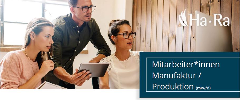 Wir freuen uns auf Dich und auf Deine aussagekräftige Bewerbung mit Angaben zum frühestmöglichen Eintrittstermin und Deiner Gehaltsvorstellung an Bewerbung@ha-ra.de